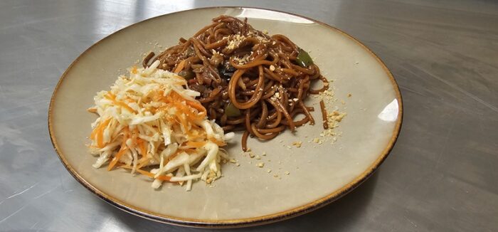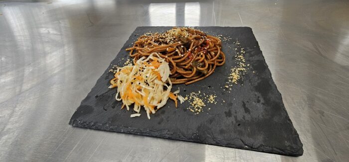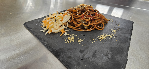 Następnie przenieśliśmy się do Japonii, gdzie stworzyliśmy makaron z warzywami w sosie teriyaki, wzbogacony chrupiącymi, prażonymi orzeszkami. To połączenie słodyczy, umami i świeżych warzyw świetnie oddało klimat japońskiej kuchni.
